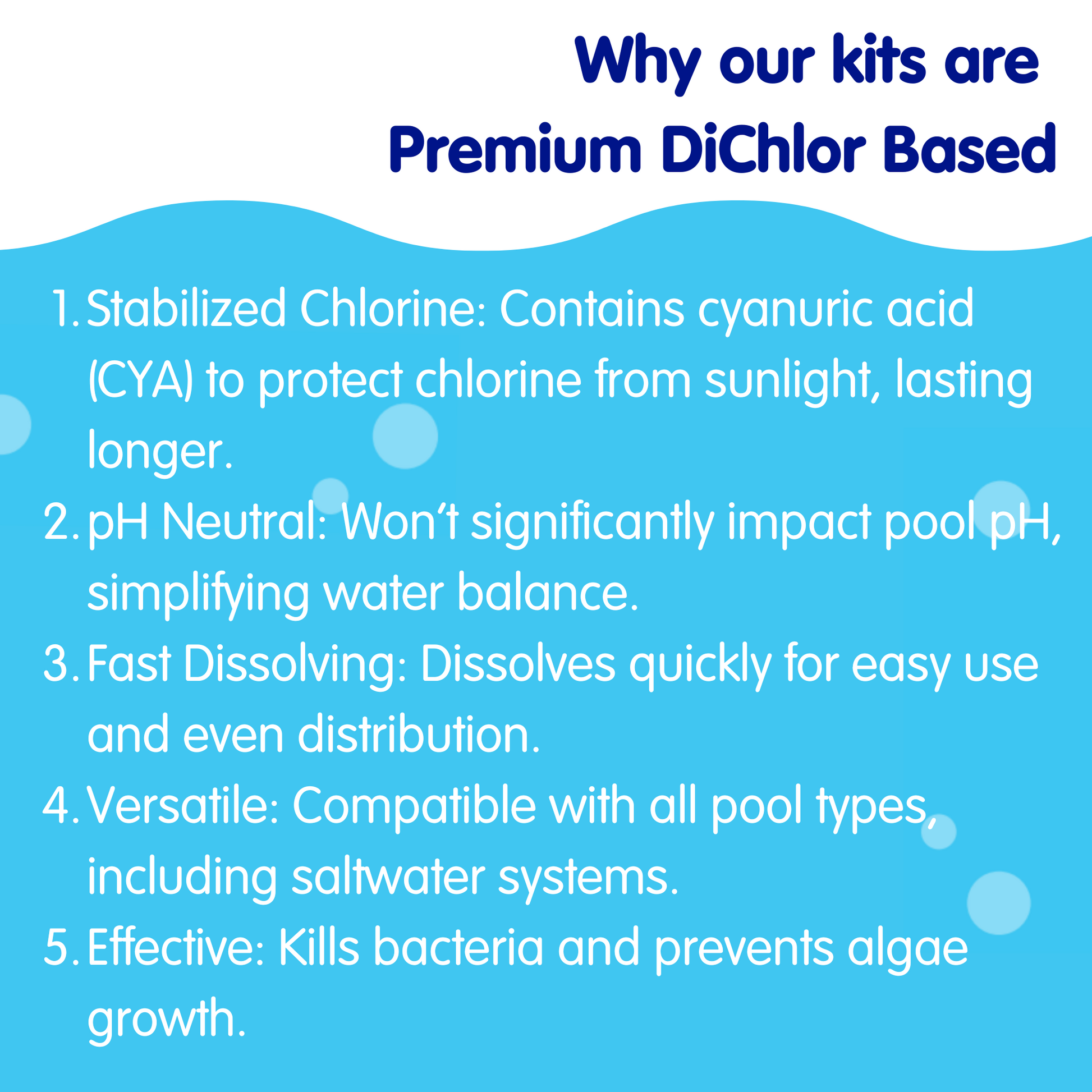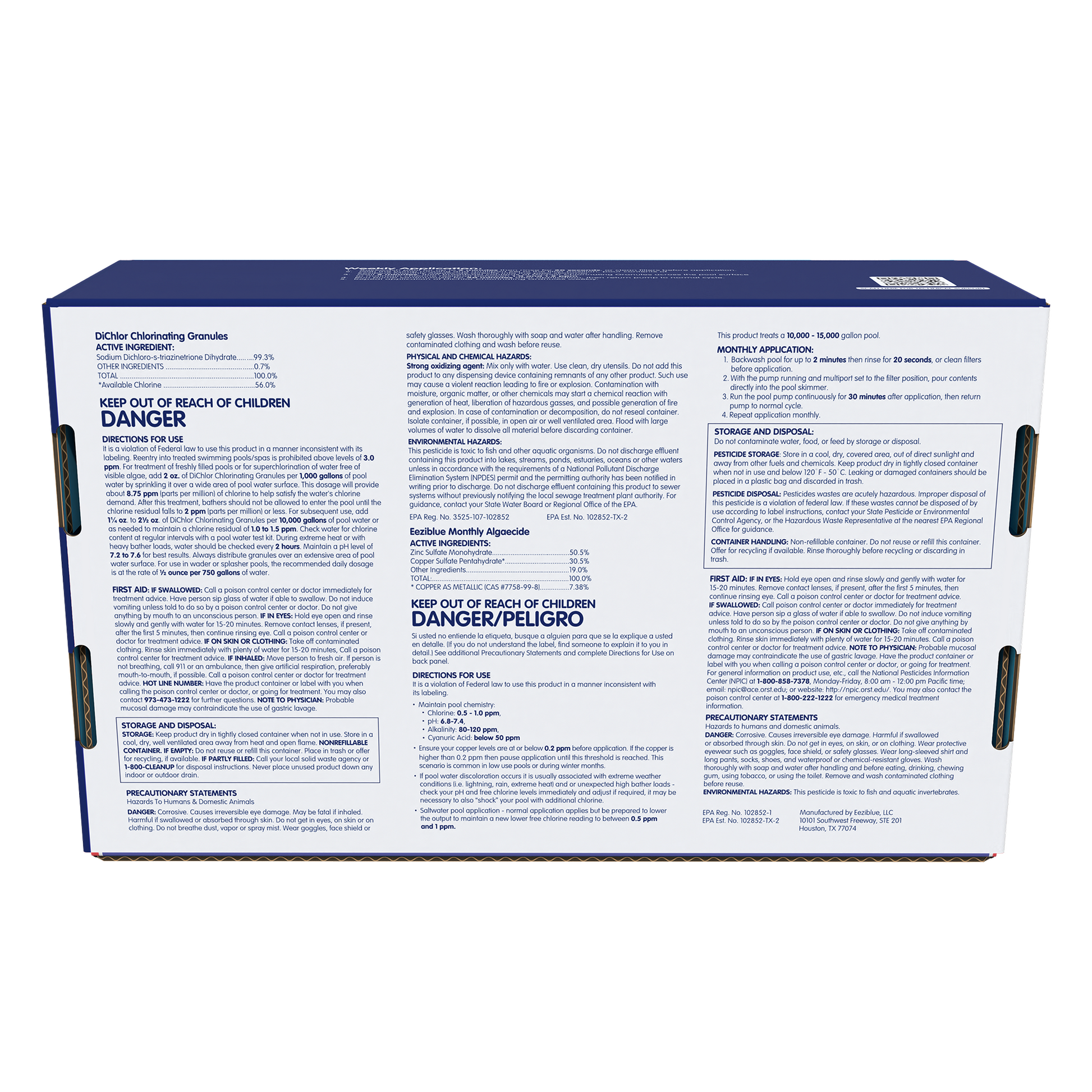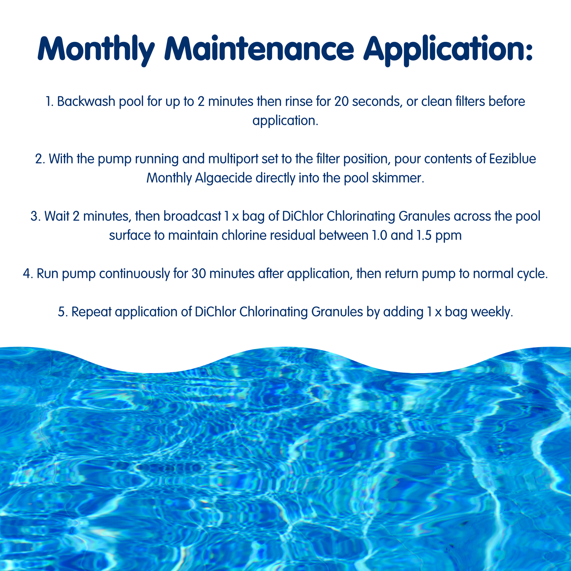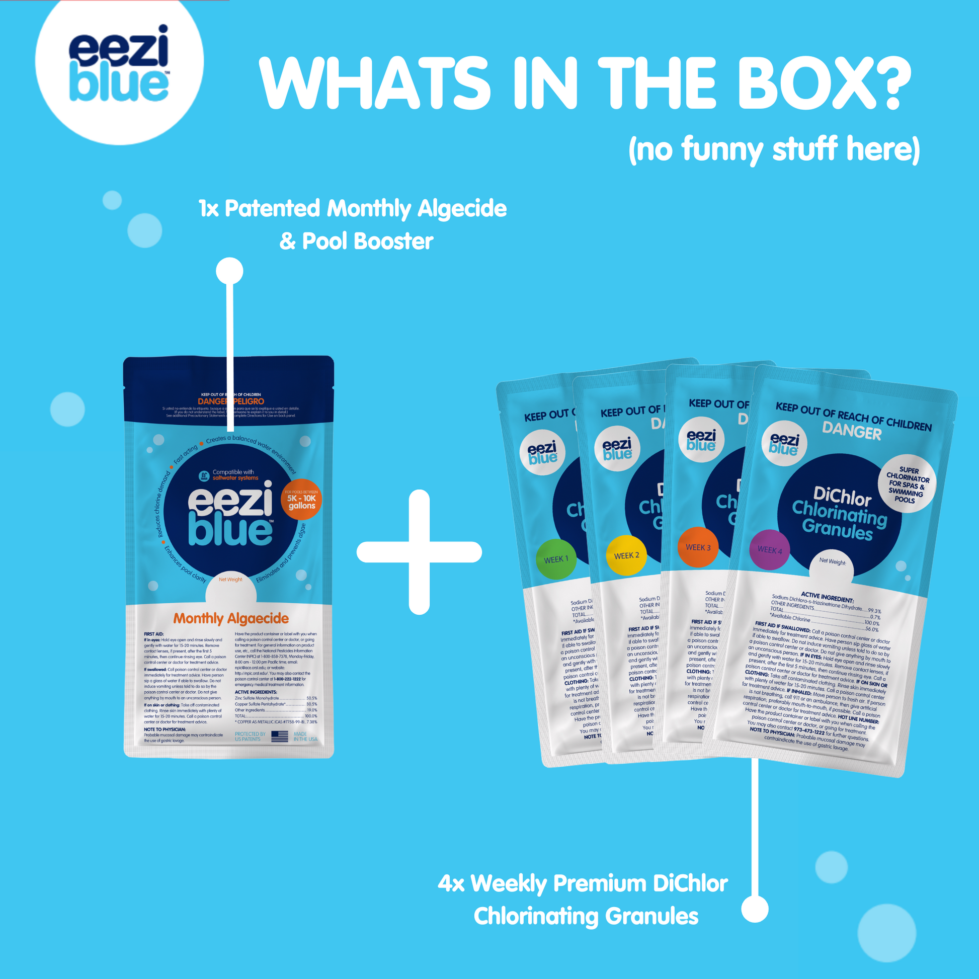 "Eeziblue is a monthly pool additive that utilizes a patented CuZn Synergy formula, combining copper and zinc to effectively eliminate and prevent algae growth."